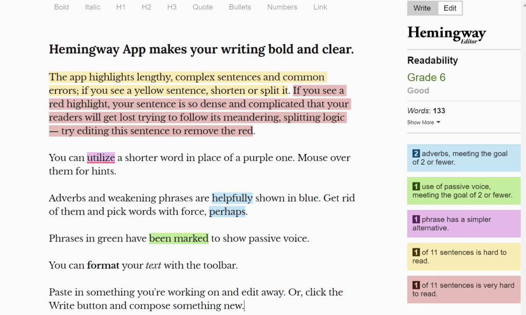 Readability is a big factor of the Hemingway App. And it tells you the readability of your text on a graded system using the reliable algorithm of the Automated Readability Index. The debate of the importance of readability is an interesting one. Just because it has a high readability grade, that doesn’t make the writing necessarily good. And vice versa. However, undeniably in our modern world, people have less patience for difficult-to-read texts. So, bear that in mind while writing.