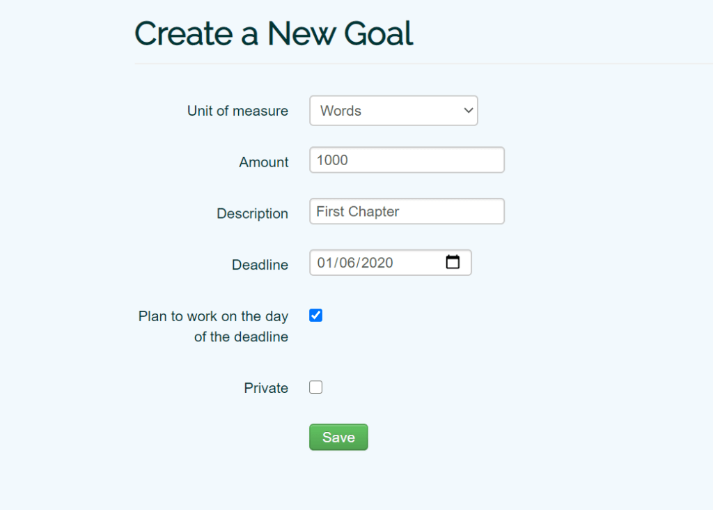 Create deadlines easily by setting a goal. Then choose a unit of measure such as lines, words, or chapters. Choose an amount, a description, and a deadline. Then get writing. You can track your progress and update your total as you go along. It’s extremely satisfying when you reach your goal. And that encourages you to keep going.